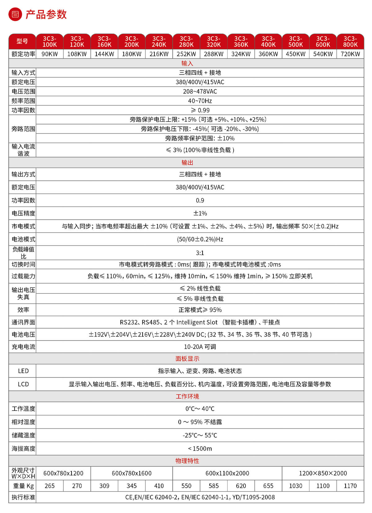 8、三進(jìn)三出純?cè)诰€雙變換式產(chǎn)品,支持380/400/415V,50/60Hz 電網(wǎng)體系,提供最合適的供電質(zhì)量與負(fù)載保護(hù);